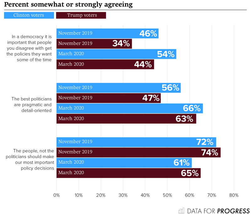 The public also appears to increasingly agree that “the best politicians are pragmatic and detail-oriented” and that “the people and not the politicians should make the most important policy decisions.”
